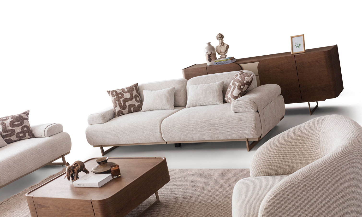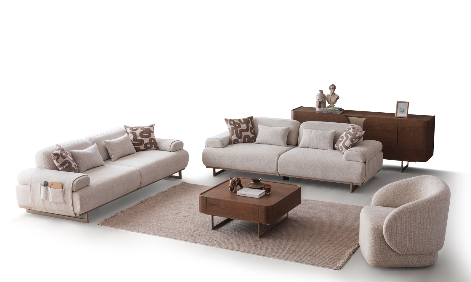2 adet Üçlü kanepe (Kollar açıldığında 6 kişilik kanepe haline gelir), ve 1 adet tekli berjerden oluşmaktadır. (Mekanizmalar sayesinde, takım 13 kişilik oturum hacmi sunar)